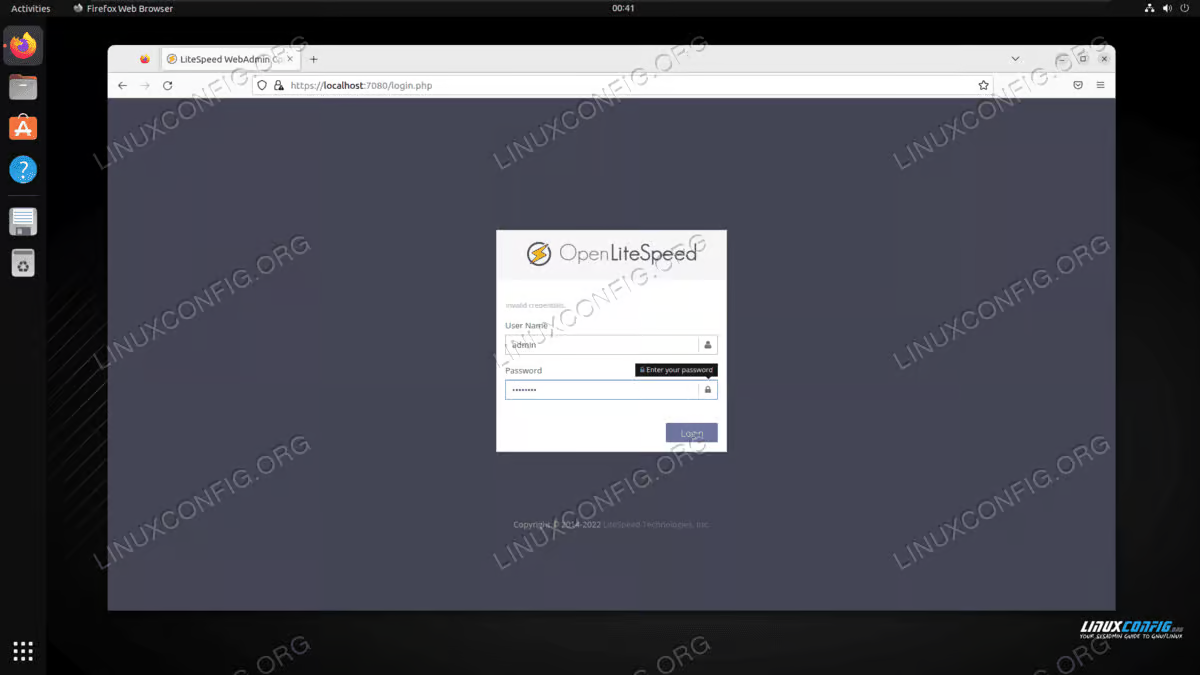 Start by navigating to the OpenLiteSpeed web admin panel at https://localhost:7080/login.php and log in with your administrator credentials.plaintextCopy code$ https://localhost:7080/login.php
