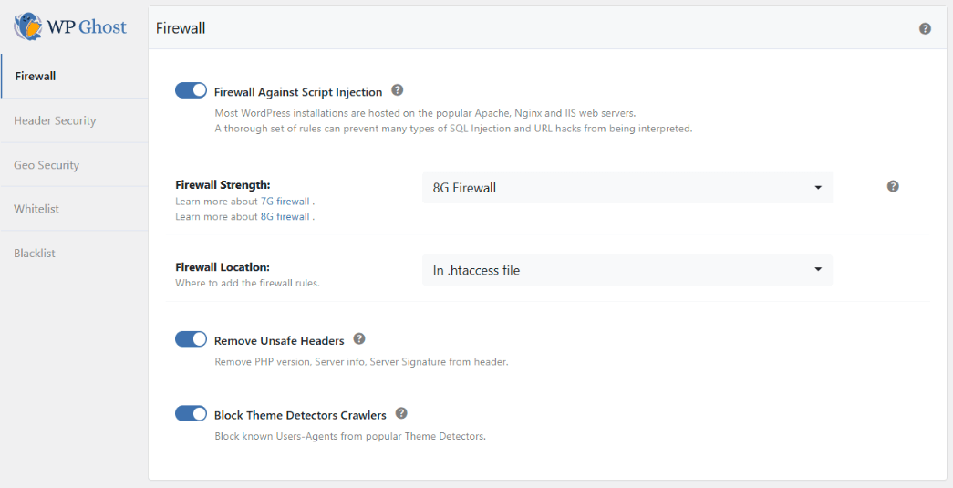 Go to WP Ghost > Firewall and activate Firewall Against Script Injection.